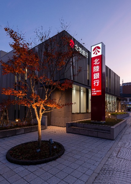 豊平支店・帯広支店に次ぐ北陸銀行シリーズの第三弾店舗となります。一目で北陸銀行店舗と認識できるデザインのルールを踏襲しつつ、小樽駅から観光地である小樽運河に向かう大通に建つことを意識したデザインとしました。大庇でお客様や観光客を迎え入れ、歩道に面した部分には地域素材である軟石を使用することで、街の広場としての外部空間を演出しています。また銀行の顔であるATM・ロビー空間は、外部空間から連続する軟石の壁や、温かみのある無垢杉板壁によりおもてなしの空間としています。
