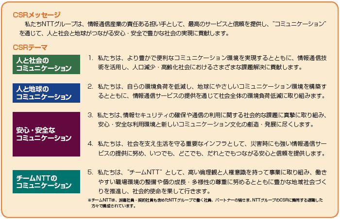 NTTは、グループ各社が推進してきたCSRをより積極的な活動をするための基本方針として、2006年6月、グループのCSRのあり方を表現した「CSRメッセージ」と、具体的な重点取り組み項目を示した4つの「CSRテーマ」で構成する「NTTグループCSR憲章」を制定しました。また、ISO26000の発行を踏まえ、2011年6月、「チームNTTのコミュニケーション」の内容が一部改定されました。