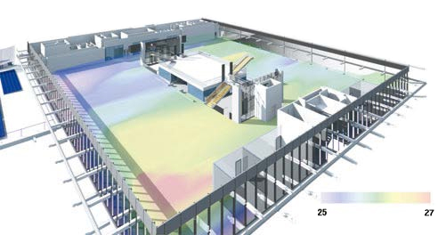 現在建築中のNTTデータ三鷹第二データセンターは、このような観点に立ち、最先端の空調機器・システムの導入は勿論、先進的な設計手法を採用しています。具体的には、高度な解析技術を活用した建物全体のレイアウト検討を設計段階から実施する一方、建物の3次元デジタルモデルに設備情報や管理情報などの属性データを追加した建築物のデータベース「BIM※」を積極的に用いた設計となっています。これにより、構築時には施設内の各種レイアウトや、工事上の不都合などを事前に確認できる一方、稼働後も定期的な設備管理や設備更改計画の策定が効率的に実施できます。