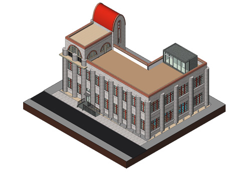 田中絹代ぶんか館は、大正時代特有の設計、装飾が数多く現存する当時の時代背景や文化を現す貴重な建築財産です。近代建築資料として後世に残し、広く認識していただくため「ビルディング・インフォメーション・モデリング(BIM)*」の手法で、建物全体の3Dモデル化を行ってきました。また、近代建築資料を後世に残すという目的の他にも3Dモデルの利用により、2Dの図面データと比較し、建物内外の詳細が分かるため、効率的な建物の修繕・保全が可能となります。