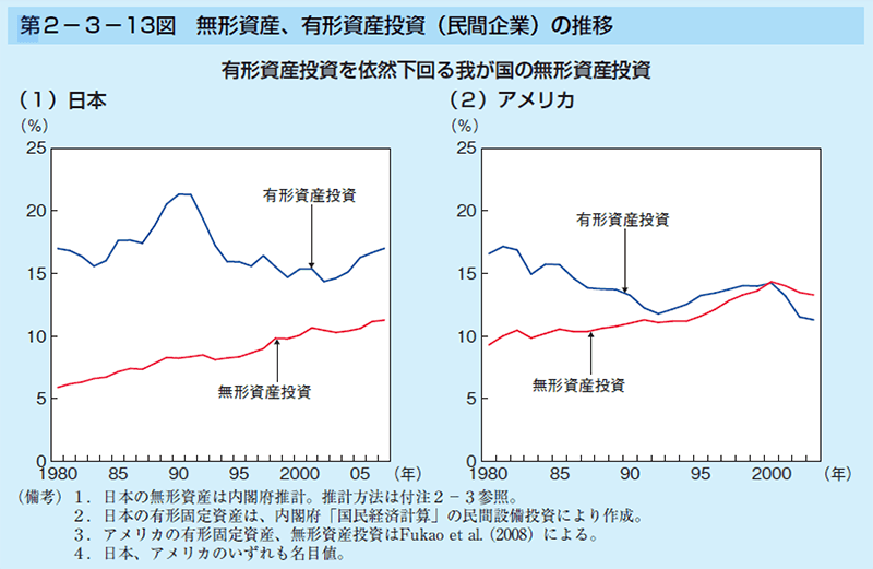 民間企業による無形資産と有形資産への投資率の変化を、日本とアメリカで比較した興味深い内閣府の経済白書データがあります。かつて人材や知財といった無形資産よりも、土地や建物のような有形資産に投資をしていたのは、日本もアメリカも同じでした。しかし、アメリカでは1990年代から無形資産への投資率が上向きはじめ、2000年代初頭には有形資産への投資率を追い抜きました。対して、日本企業は有形資産への投資率のほうが高いまま現在に至っています。