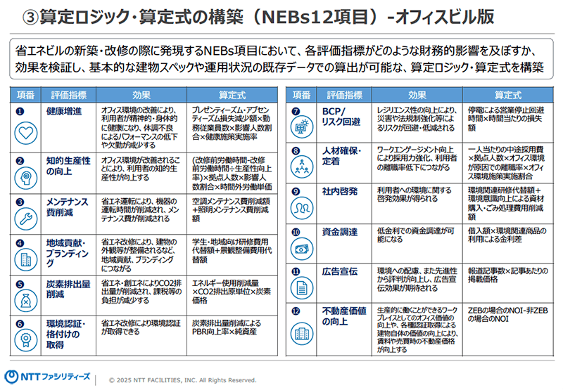 NTTファシリティーズは、建築物が従業員や顧客、地域社会に与える総合的な付加価値を12項目で整理した「NEBs(Non-Energy Benefits)」という独自の指標を整備したと聞きました。NEBsのスコアが高ければ高いほど、ビルやオフィスのもたらすアウトカムが大きいというわけです。